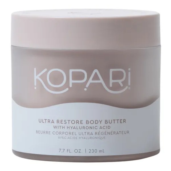 Kopari Beauty’s vegan Ultra Restore Body Butter with Hyaluronic Acid restores skin and provides long-lasting hydration with its fast-absorbing, lighter-than-air whipped formula infused with Kopari’s signature Sweet Coconut Milk scent.