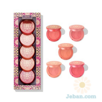 A quintet of five vegan, 12-hour blushes in travel-sized compacts.